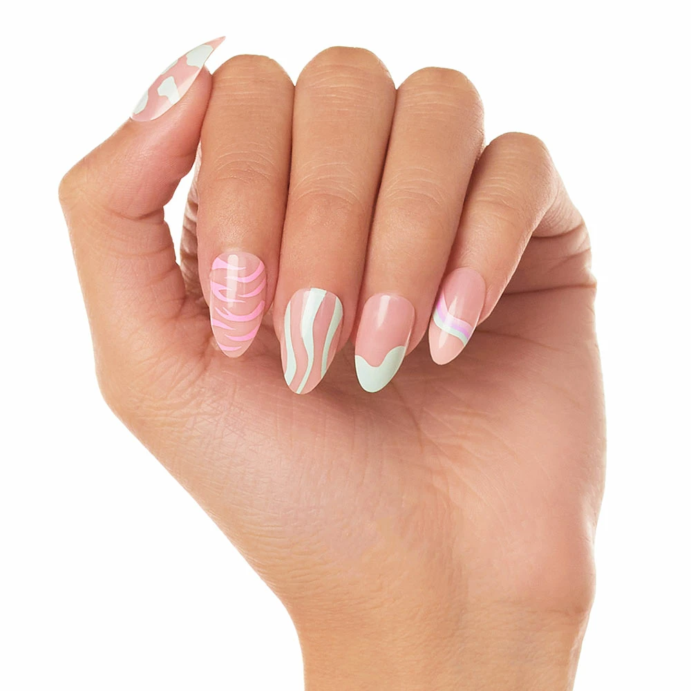 Add a little bit of the wild side to your everyday looks with Wild Card. These semi-transparent press-on nails perfectly highlight your natural look and your spunky personality all at once! Each nail features a different artsy design in various pastels of pink, purple and green.